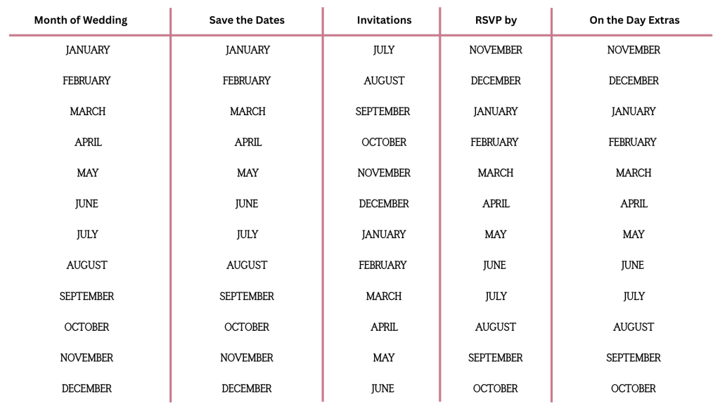 Please use our wedding stationery guide to see the recommended latest date to get your wedding stationery organised along with recommended RSVP dates. These are only guidelines, if you already have your venue booked and have finalised details then the sooner the better.