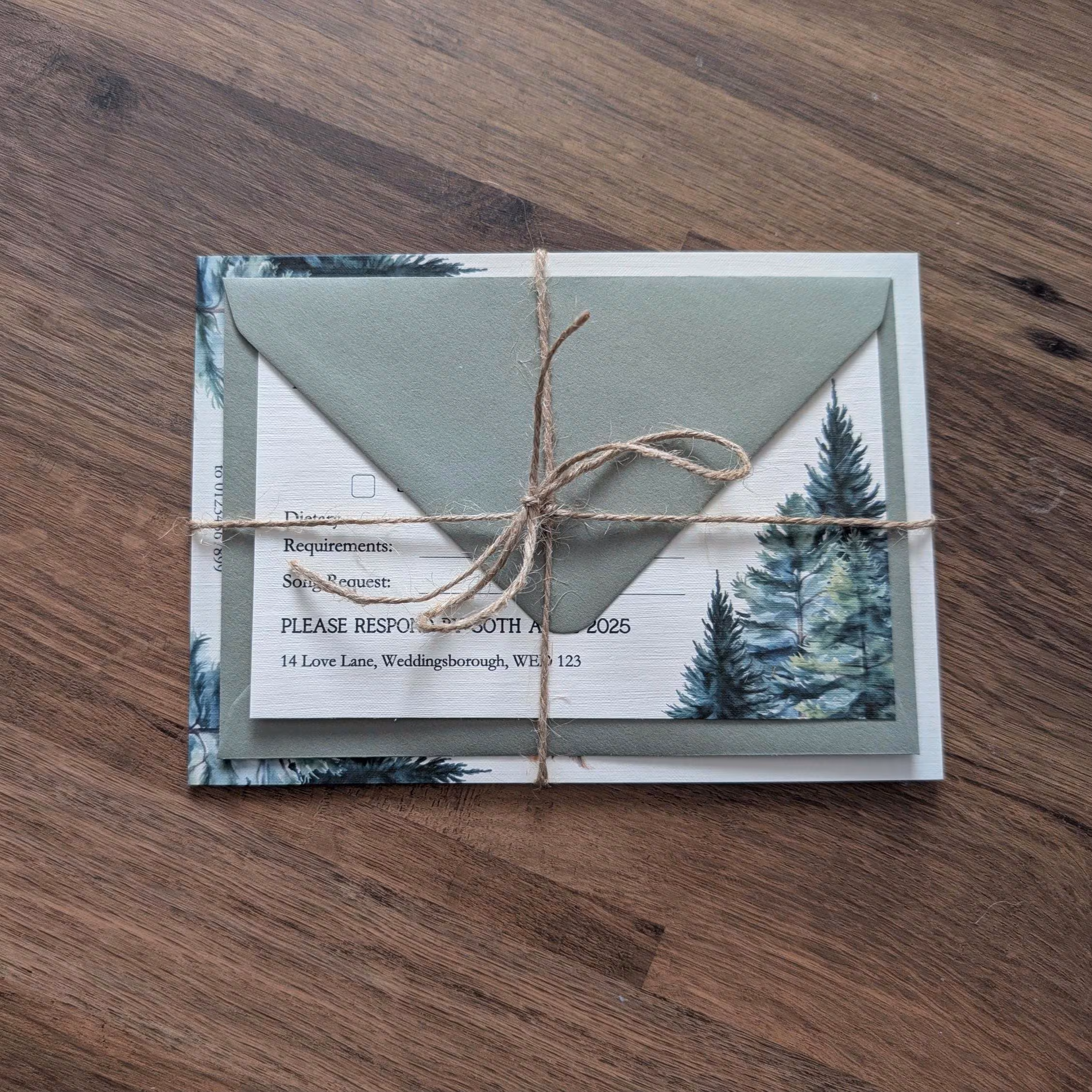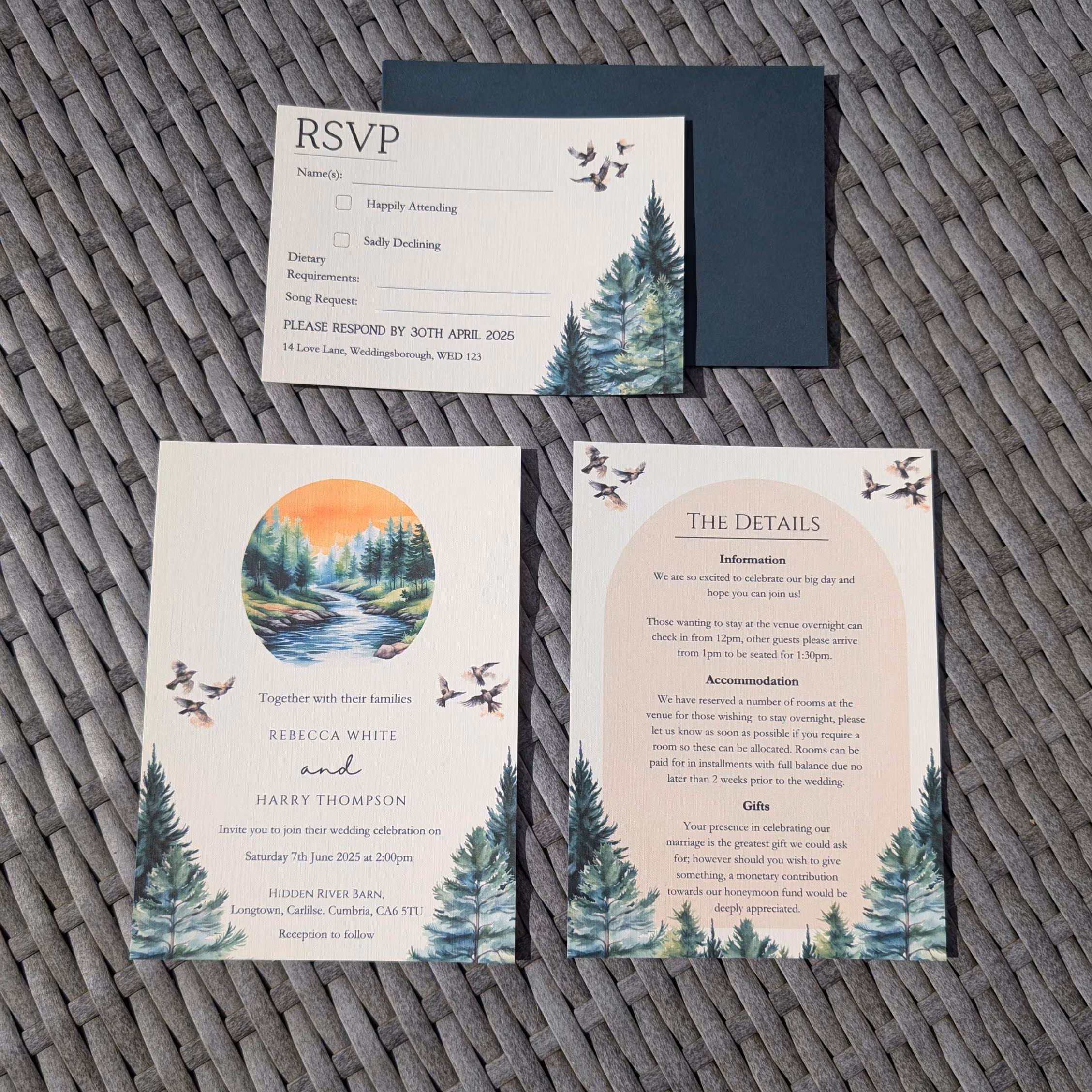Forest sunset rustic wedding invitation set. Perfect for that outdoor or barn wedding. Invitations can include a matching evening invitation (can be seen in images), RSVP card and Guest Information card. These designs are physical prints and NOT a digital download. We also include FREE envelopes with all invitations and RSVPs!